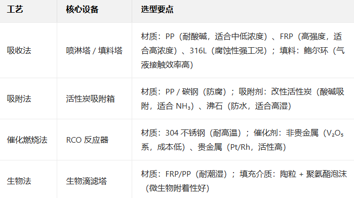 中濃度NH?廢氣(1000-5000mg/m³):首選吸收法(酸吸收/水吸收,投資與運行成本平衡),需達標排放可搭配吸附法。