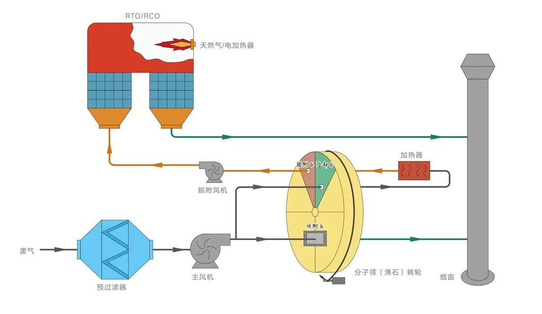 RTO把有機廢氣加熱到760攝氏度以上,使廢氣中的VOCs在氧化分解成二氧化碳和水。氧化產生的高溫氣體流經陶瓷蓄熱體,使陶瓷體升溫而“蓄熱”,此“蓄熱”用于預熱后續進入的有機廢氣,從而節省廢氣升溫的燃料消耗。陶瓷蓄熱體應分成三個(含三個)以上的區或室,每個蓄熱室依次經歷蓄熱-放熱-清掃等程序,周而復始,連續工作。蓄熱室“放熱”后應立即引入部分已處理合格的潔凈排氣對該蓄熱室進行清掃(以保證VOC去除率在99%以上),只有待清掃完成后才能進入“蓄熱”程序。RTO蓄熱式焚燒廢氣處理設備,是目前最為經濟可靠的達到50mg/m3嚴格的排放標準的VOCs治理技術,得到了廣泛的應用。