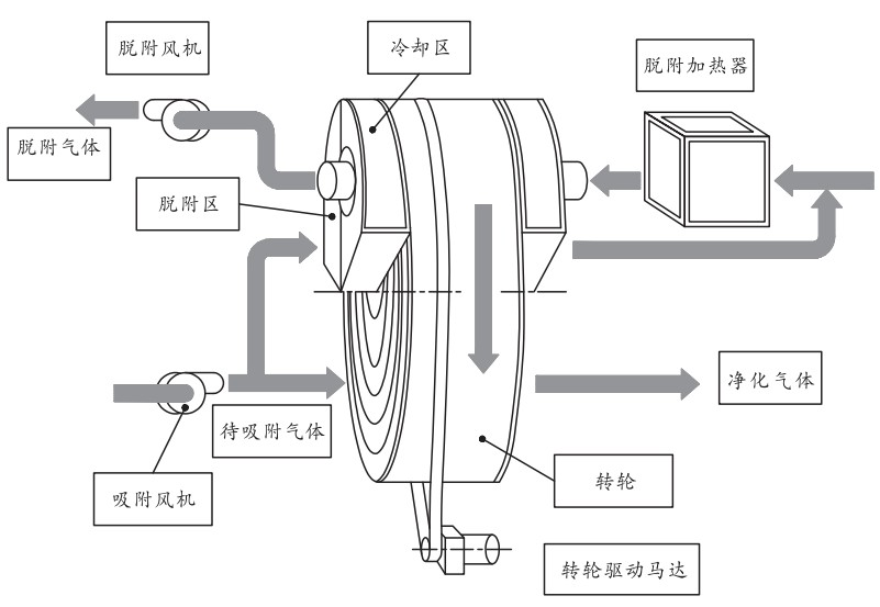 沸石轉輪濃縮結構分為處理區(qū)、再生區(qū)、冷卻區(qū),濃縮轉輪在各個區(qū)內連續(xù)運轉。VOC有機廢氣通過前置過濾器后,通過濃縮轉輪裝置的處理區(qū)。在處理區(qū)VOCs被吸附劑吸附去除,凈化后的空氣從濃縮轉輪的處理區(qū)間排出。