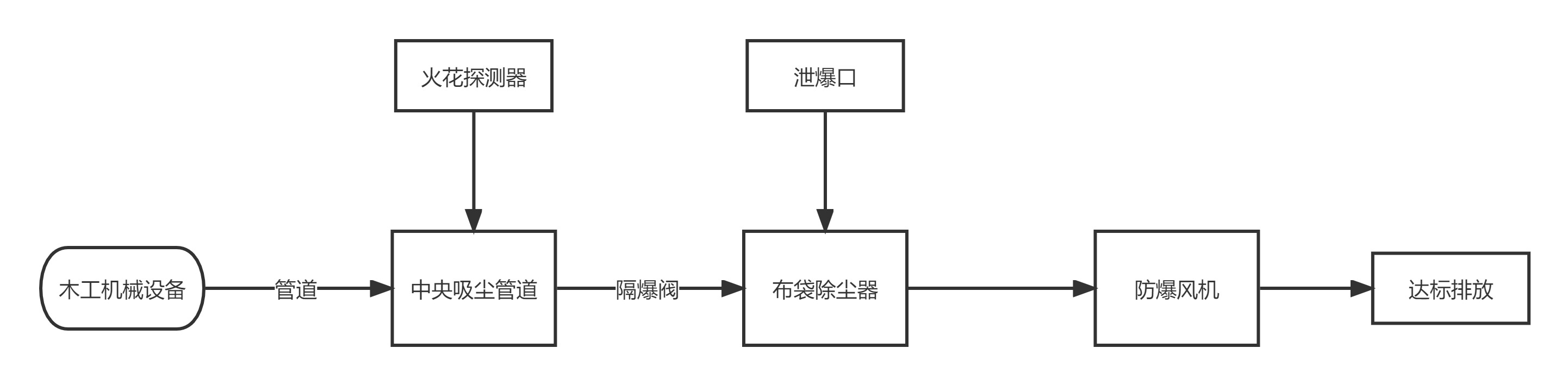 常見的木工機械設備包括鋸切設備、封邊設備、鉆孔設備、貼面設備、刨床設備、銑床設備、砂光設備、車床設備以及高速木材加工中心等在加工過程中會產生大量粉塵和木屑,粉塵量大、粒度細且容易帶靜電,所以需在木工加工上方安裝過濾精度高的木工除塵設備進行處理。并在管設計時在管路上多開檢修、增設火花探測儀、隔爆閥、泄爆片裝置時刻監視管路中粉塵情況,保證車間除塵的安全性和高效性。