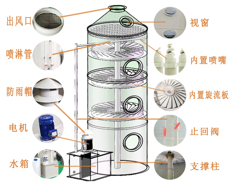 以PP材質(zhì)為例,噴淋塔與旋流塔的區(qū)別在于內(nèi)部?jī)艋b置系統(tǒng);噴淋塔通常為兩層噴淋一層除霧,填料層為PP一體成型格柵板或者PP格柵拼接加工后作為支撐填料層的底板。填料根據(jù)廢氣成分可以選擇PP多面球或者PP拉西環(huán);填料層上方為噴淋裝置,頂部為除霧大小頭。旋流塔通常為兩層旋流一層除霧,旋流塔沒(méi)有填料層,是旋流葉片,沒(méi)有填料層不需要放填料,所以也就不會(huì)堵塞,對(duì)于漆霧處理以及粉塵廢氣處理就比較更適合。旋流葉片上方和噴淋塔一樣有噴淋裝置,頂部為除霧大小頭處理原理:噴淋塔處理廢氣機(jī)制為氣液逆流接觸。以酸性廢氣為例,酸性廢氣由塔底進(jìn)入,噴淋塔循環(huán)水泵開(kāi)啟后,水箱內(nèi)堿性液體由塔頂進(jìn)入,經(jīng)過(guò)噴淋裝置(噴嘴)噴成霧狀或雨滴狀;氣液逆流,在填料層酸堿中和。凈化后氣體經(jīng)過(guò)除霧大小頭后排出。旋流塔處理廢氣機(jī)制為塵粒與液滴的慣性碰撞,離心分離和液膜黏附。頭層旋流葉片為順時(shí)針葉片噴淋,二層為逆時(shí)針葉片噴淋,起到順逆兩相氣體相沖變化,從而使粉塵或者漆霧渣滓流入塔底,第三層為除霧大小頭。