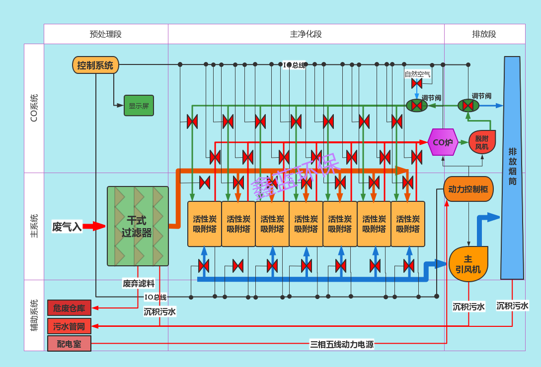 1.干式過濾箱2.活性炭吸附箱3.催化燃燒設備4.管道5.電控系統5.安全系統