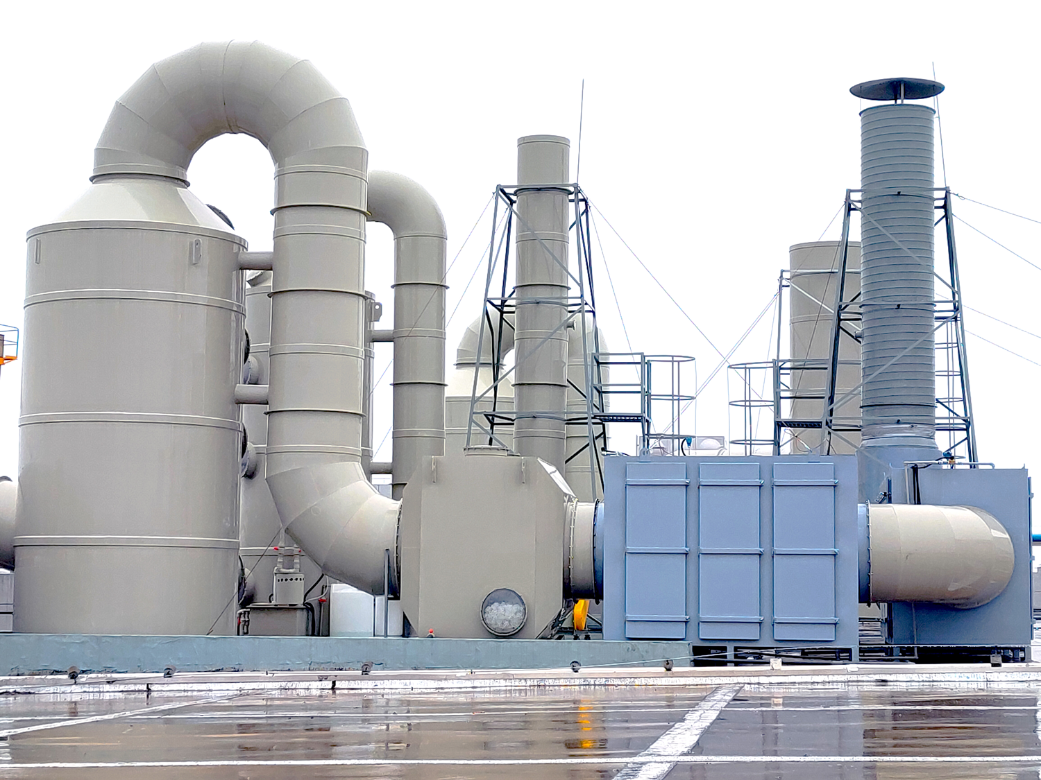 原理:在洗滌塔中,廢氣與化學藥劑(如NaOH、NaClO、H?SO?等)發生酸堿中和或氧化還原反應,從而被去除。