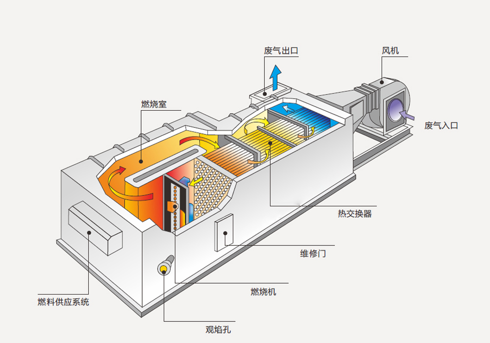 TO直燃爐是該處理工藝的核心設(shè)備,主要包括燃燒室、燃燒器、換熱器、煙道等部分。其中,燃燒器用于將燃料(如燃油、燃?xì)獾龋┺D(zhuǎn)化為高溫火焰,對(duì)廢氣進(jìn)行加熱;換熱器則用于回收燃燒過(guò)程中的熱量;煙道則用于傳輸尾氣,確保其順利排放。
