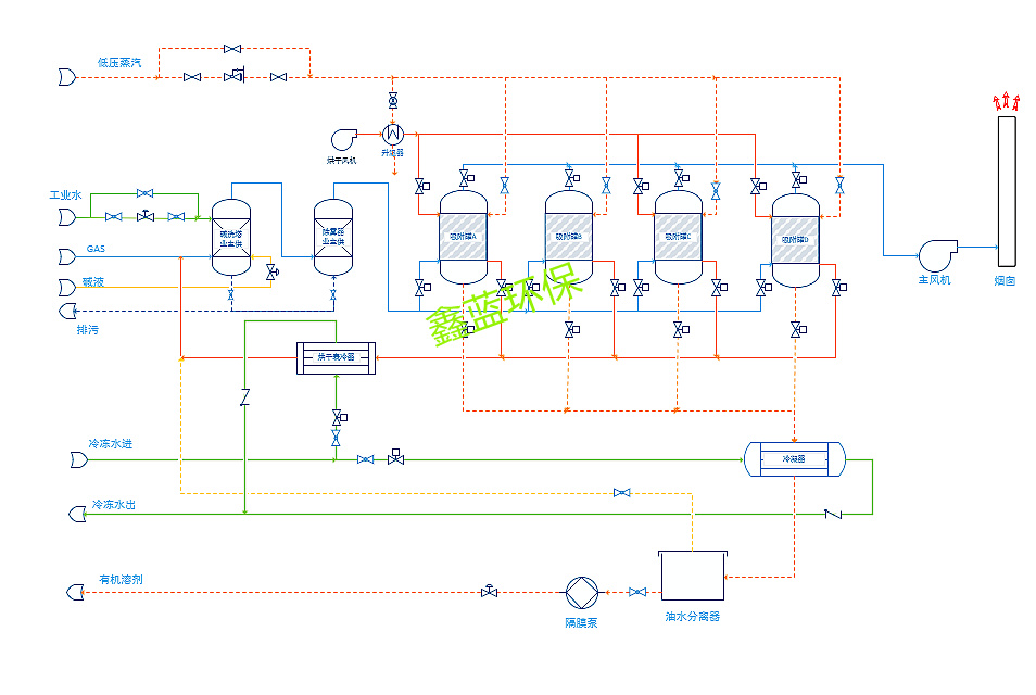 VOCs廢氣處理-深冷冷凝回收系統先通過干式過濾,將廢氣中顆粒狀污染物截留去除,然后進入吸附床進行吸附,利用具有大比表面積的活性炭將有機溶劑吸附在活性炭表面,經處理后的潔凈氣體經過風機、煙囪達標排放。