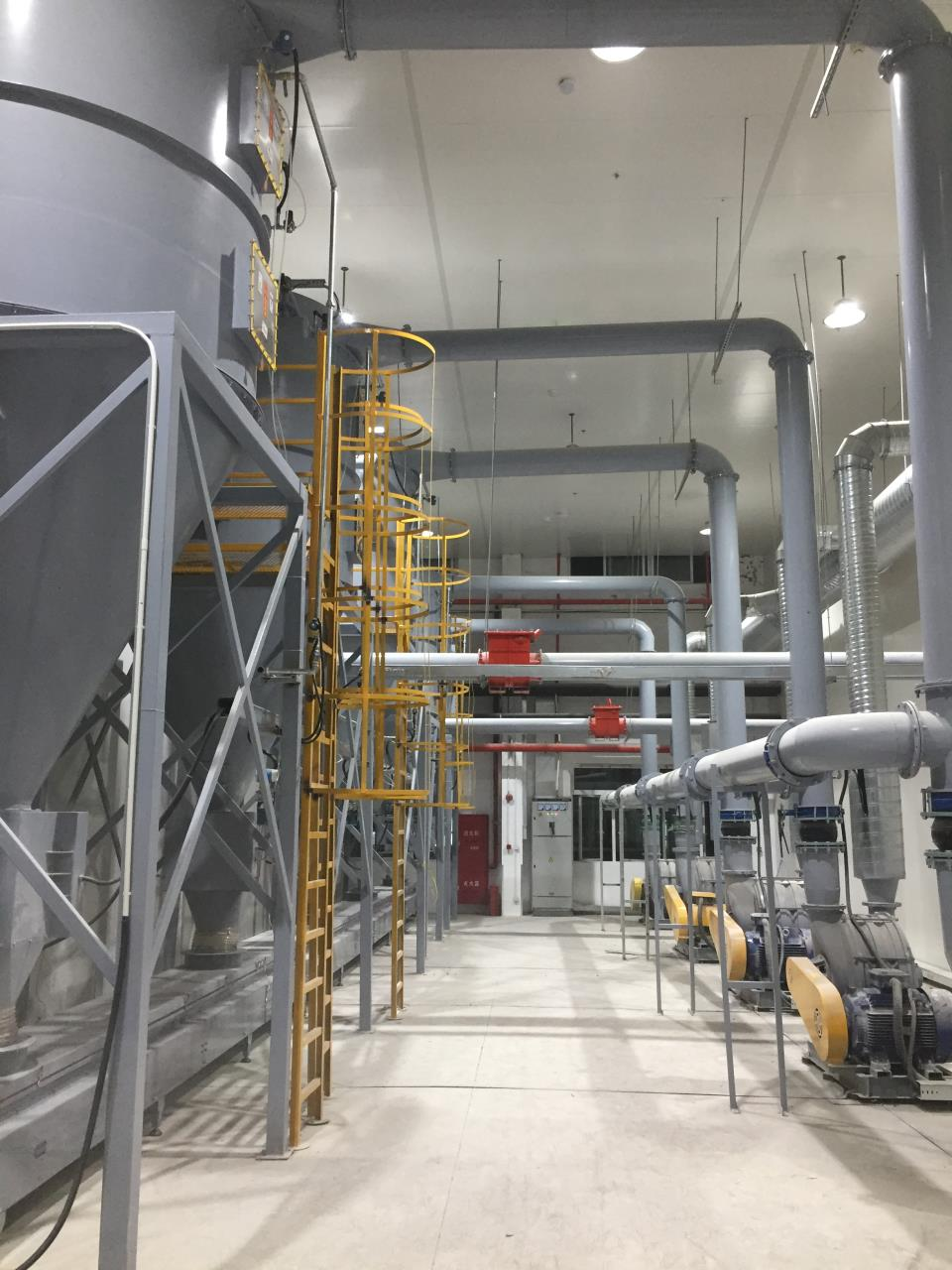 用于通過氣動輸送裝置收集灰塵的袋式除塵器具有較大的空氣體積,高的粉塵濃度和箱體的耐壓性,因此圓柱形狀很大。有條件的公司可以用塑料板過濾器代替袋式過濾器。圓柱形盒入口切向地定向以提供分離,并且許多旋轉式反吹袋過濾器是這種類型。有時灰斗是旋風的形式。氣動輸送系統的袋式除塵器,由于粉末量大,灰斗容積和排灰口直徑應設計得更大,除塵裝置的容量應足以避免殘留粉末在灰桶里。
