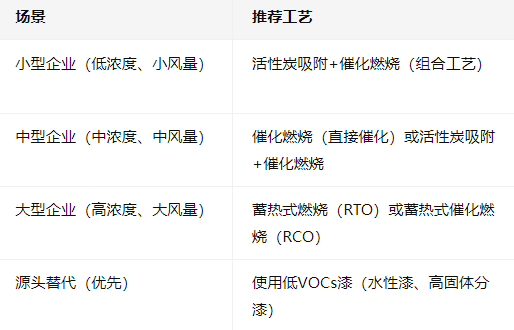 根據(jù)廢氣中VOCs濃度(低/中/高)、風(fēng)量、成分,選擇合適技術(shù):