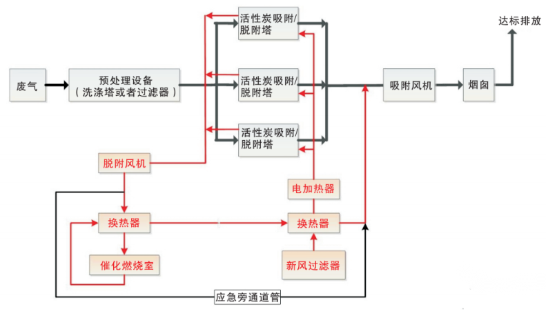 由離心風(fēng)機(jī)將大風(fēng)量、低濃度有機(jī)廢氣吸入活性炭吸附床,在吸附床內(nèi)與多層蜂窩狀活性炭充分凈化(吸附),活性炭內(nèi)部逐漸富集濃縮大量有機(jī)廢物,而潔凈的氣體則排入大氣;通過燃燒裝置產(chǎn)生的高溫氣體經(jīng)換熱之后通入活性炭吸附床,使內(nèi)部有機(jī)廢物90℃高溫氣化從活性炭孔隙中逸散而出,此時的廢氣濃度遠(yuǎn)遠(yuǎn)高于初始吸附的廢氣濃度,然后進(jìn)入催化燃燒裝置(350℃)進(jìn)行氧化分解成CO2和H2O等無害氣體,氣體經(jīng)由熱交換器將熱量傳遞再次用于脫附,最后排入大氣,以此完成一整套凈化流程。