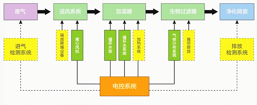 生物法廢氣治理是一種有效的空氣污染物控制方法,可去除空氣中的異(臭)味揮發性物質和有害物質,利用微生物將空氣中的揮發性有機物以及硫化氫和氨等惡臭物質降解并轉化CO2和H20等物。