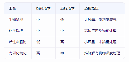 化學洗滌(除H?S/NH?)→生物濾池(除VOCs)→活性炭吸附(應急保障)。