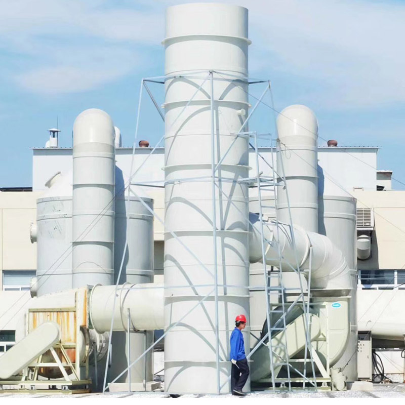 噴淋洗滌塔采用氫氧化鈉(NaOH)溶液(或硫酸溶液)作為吸收液來凈化酸性(或堿性)氣體,酸性(或堿性氣體)氣體由離心通風機吸入進風段后向上方流動、而噴嘴噴出的中和液由上向下噴淋。從級中噴出的中和液與上升的酸性(或堿性氣體)氣體進行氣液接觸,吸收中和液往下濕淋級填料層,使從下往升的酸性(或堿性氣體)氣體得到氣液接觸吸收中和.中和液再向下淋級填料層。再一次獲得氣液相接觸吸收中和作用;同時還增大了級中填料的濕淋量、從而加大了該填料層的氣液比;正因為酸性(或堿性氣體)氣體是自下往上升。因此通過級填料層的酸性(或堿性氣體)氣體濃度高.這樣使高濃度的酸性(或堿性)氣體曲折地從填料間空隙通過向上升時,與向下流動的中和液接觸吸收中和、可使酸性(或堿性)氣體通過該填料層后濃度急劇下降,然后再經過一排中和液噴淋,酸性(或堿性)氣體與吸收液中和后,濃度再度下降;然后再通過一個填料層和一排中和液噴淋的接觸吸收中和、使酸性(或堿性)氣體的濃度凈化到設計的預定效果。后通過防霧層經帽蓋而排入大氣。